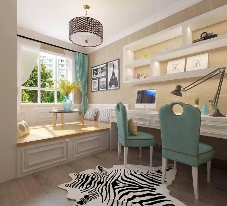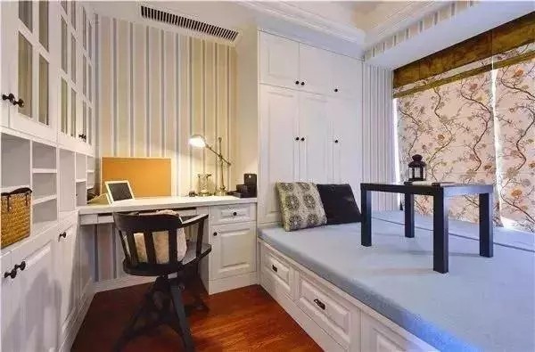 书桌和榻榻米结合,可实现办公休息一体化。如果再加上储物柜设计,那书房的收纳功能无疑超强。