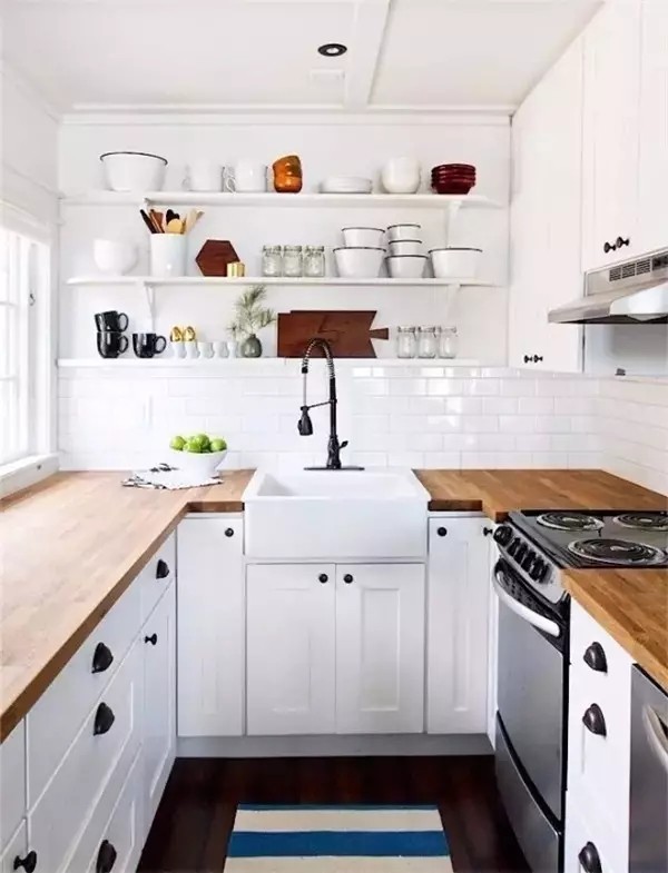 喜欢清新文艺厨房风格的可以选择木质,木头给人最原始,温暖自然的感觉,看起来也更温和舒适。木质的不管是实木还是防火板,都要注意的是不要直接把滚烫的锅子放上去,清理一定要勤快。