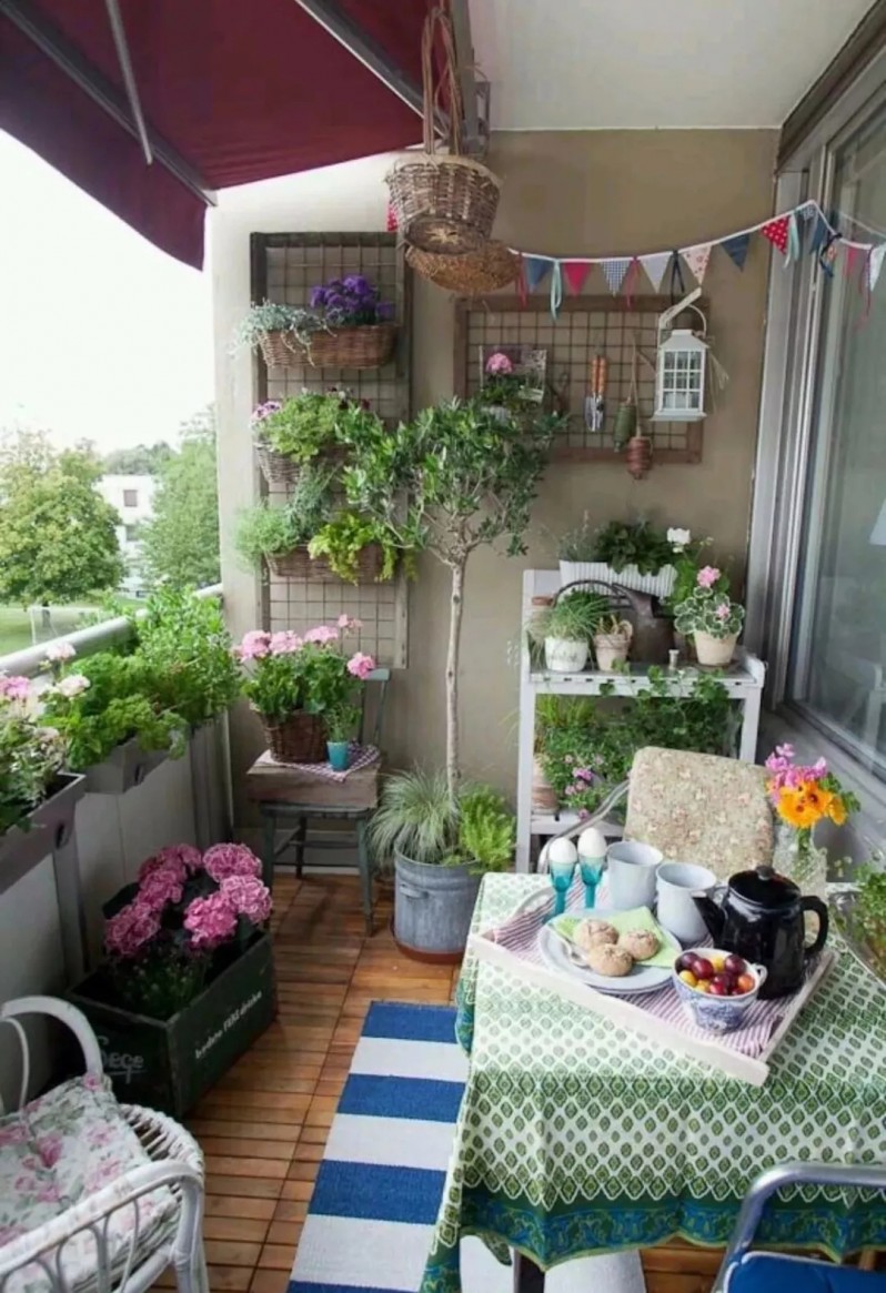 在阳台侧边的墙面上装隔板架,然后在上面摆上盆栽绿植,也是不占多少空间就能实现清新的气息;