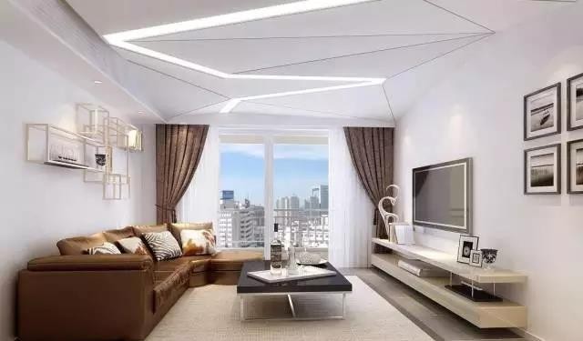 直线吊顶类似顶角线,但顶角线更窄、更细,而直线吊顶的宽度多在30-45厘米之间,厚度多在8-12厘米之间。适合房高2.6米左右,四四方方的空间,在现代简约装修风格中较为常见。