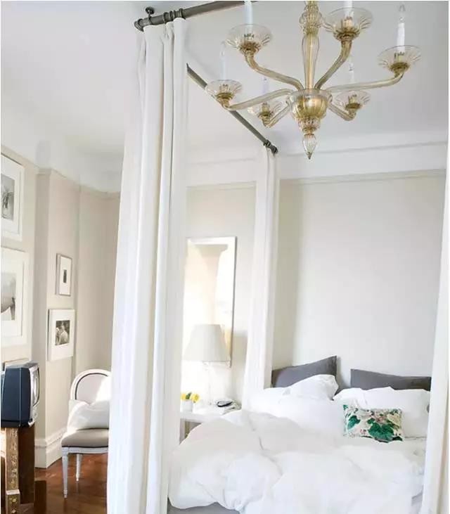 ▲只要两根窗帘架围起来,再挂上自己喜欢的任意颜色的布幔或蕾丝,自制顶篷床就搞定了,预算低了不止几倍,效果一样美丽哦。