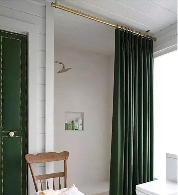 窗帘架挂在浴室应该是时下很流行的一种用法。很多卫生间都有悬挂浴帘的需要,这时候不妨使用一根钉在天花板上的窗帘杆就能很好的解决问题,省去了在墙砖上打洞的麻烦,自己动手DIY也很简单。