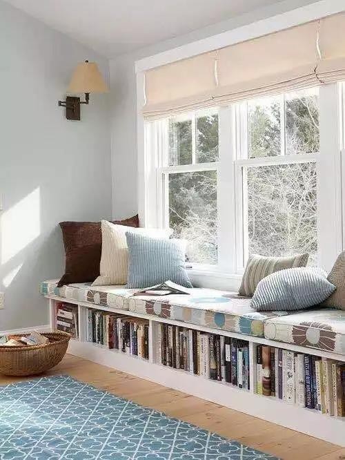 这是小置最喜欢的一种形式了,在飘窗上放置几个靠垫和抱枕,手捧着书,低头赏诗,抬头即远方,美乎妙哉。