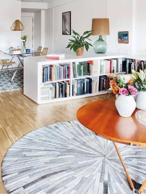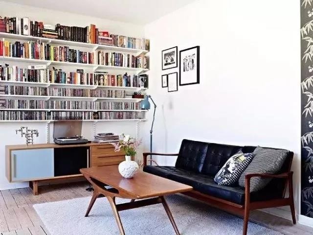 沙发不一定就要靠墙摆放,把它前移10CM,背景墙就可以变成整面的大书柜啦。