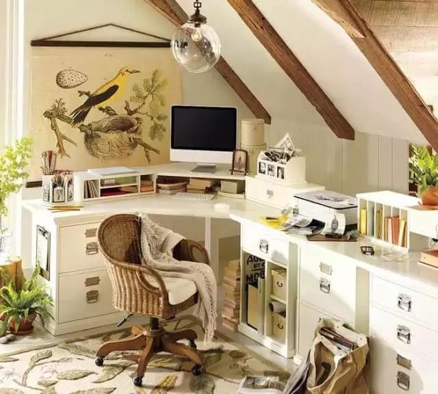 角落的空间往往被忽视,即使只有小小一块,也足够打造一片功能齐全的办公空间,最好还能拥有自然光照明和良好的通风,工作累了还可以看看窗外放松一下双眼,角落几乎看不到什么能让你分心的东西,还能更集中注意办公哦!