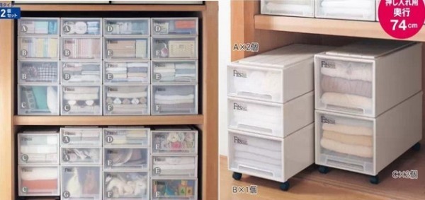 说完了衣架,还有一种超级变态的收纳盒,和一般日本家庭里面的一种”衣柜“size是配合设计的,其实是传统日式房间都会有的壁橱,分为上下两格,里面放被子什么的。就是机器猫睡觉的那种壁橱。