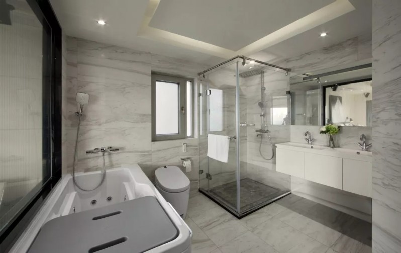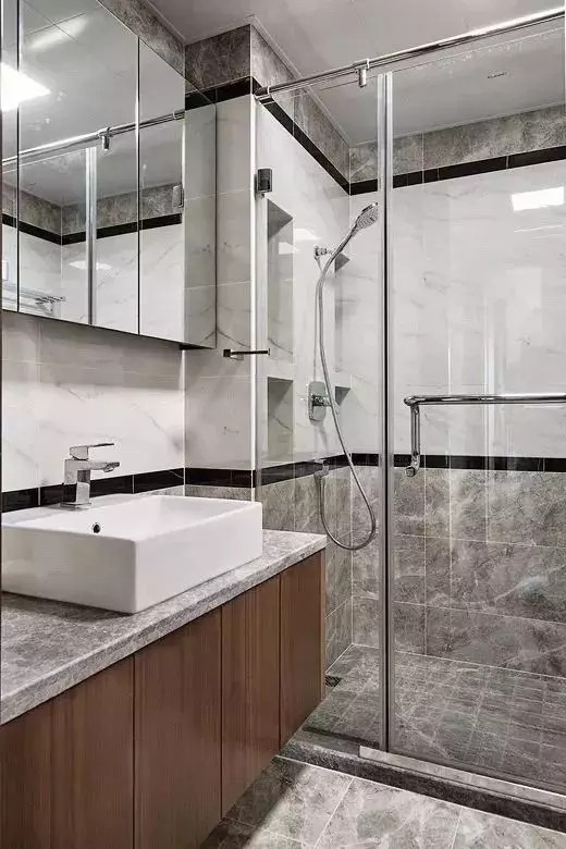 卫生间作为比较潮湿的区域,细分之下可以把卫生间分为淋浴区与梳妆、如厕区等,这些分区中,除了淋浴区比较潮湿以外,其他区域日常活动比较频繁,如果地面潮湿的话就存在滑倒的安全隐患,所以干湿分离的卫生间设计在现代装修中已经成为常态。