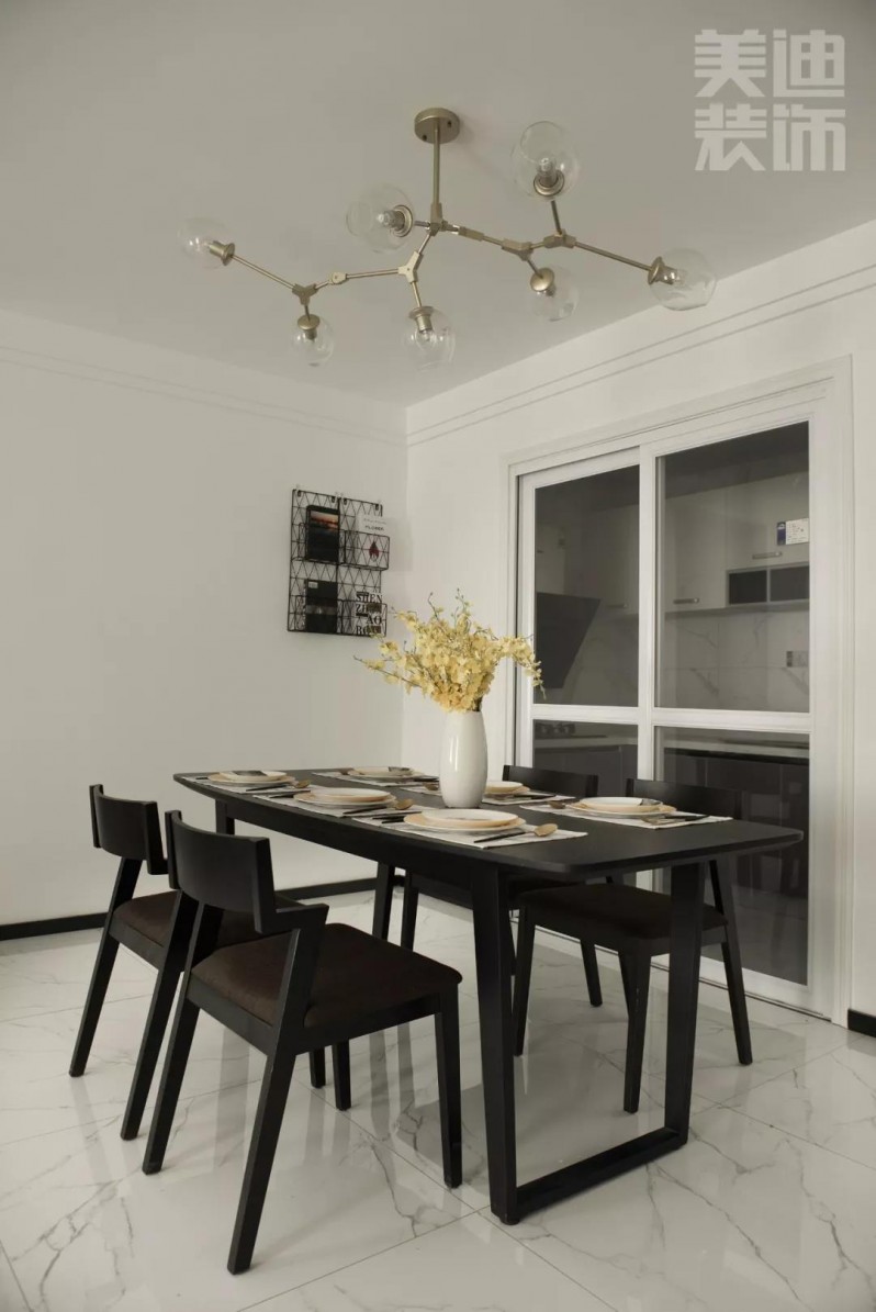 客厅与餐厅相连,将小面积空间充分的利用。黑色餐桌与客厅茶几呼应,异形吊灯、花瓶等装饰了餐厅空间。