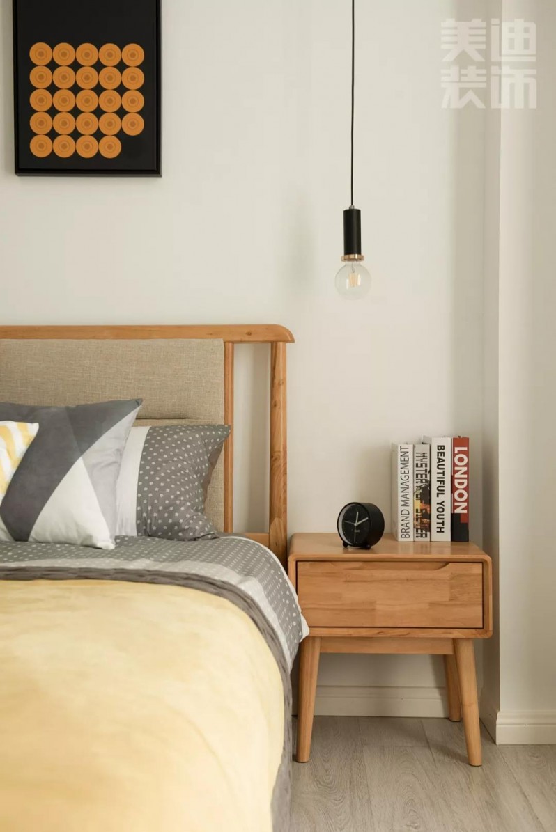 卧室布置的简单轻松,一天最安稳放松的时刻,都要在这个小空间度过,床头一侧放置了小的床头桌,可以摆放随手可拿的小物品,还有绿植、闹钟的装饰。