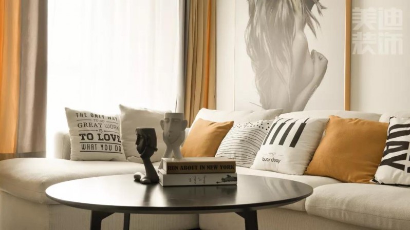 黑色茶几和米白色布艺沙发的搭配,丰富了客厅的布置和层次感。