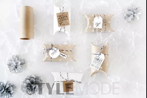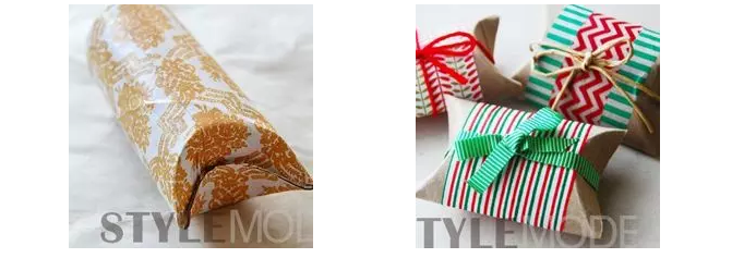 将礼物往芯筒一塞,纸筒外部贴上两三圈双面胶,然后用素色的礼物包装纸把芯筒包裹起来,两端用绳子扎好,最后剪裁一张有花纹的礼物包装纸装饰芯筒中段位置就可以了。