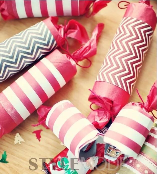 材料:厕纸芯筒、礼物包装纸、双面胶、细麻绳