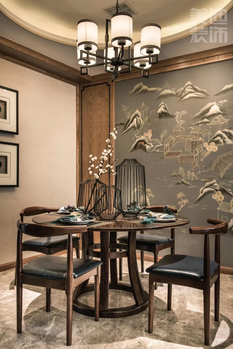 真正能够凝聚一个文化、一个传统的正是那些历久弥新的形象,比如中国文化的山与水的形象。客餐厅吊顶和家具布置,有方有圆,方圆对比运用到极致。