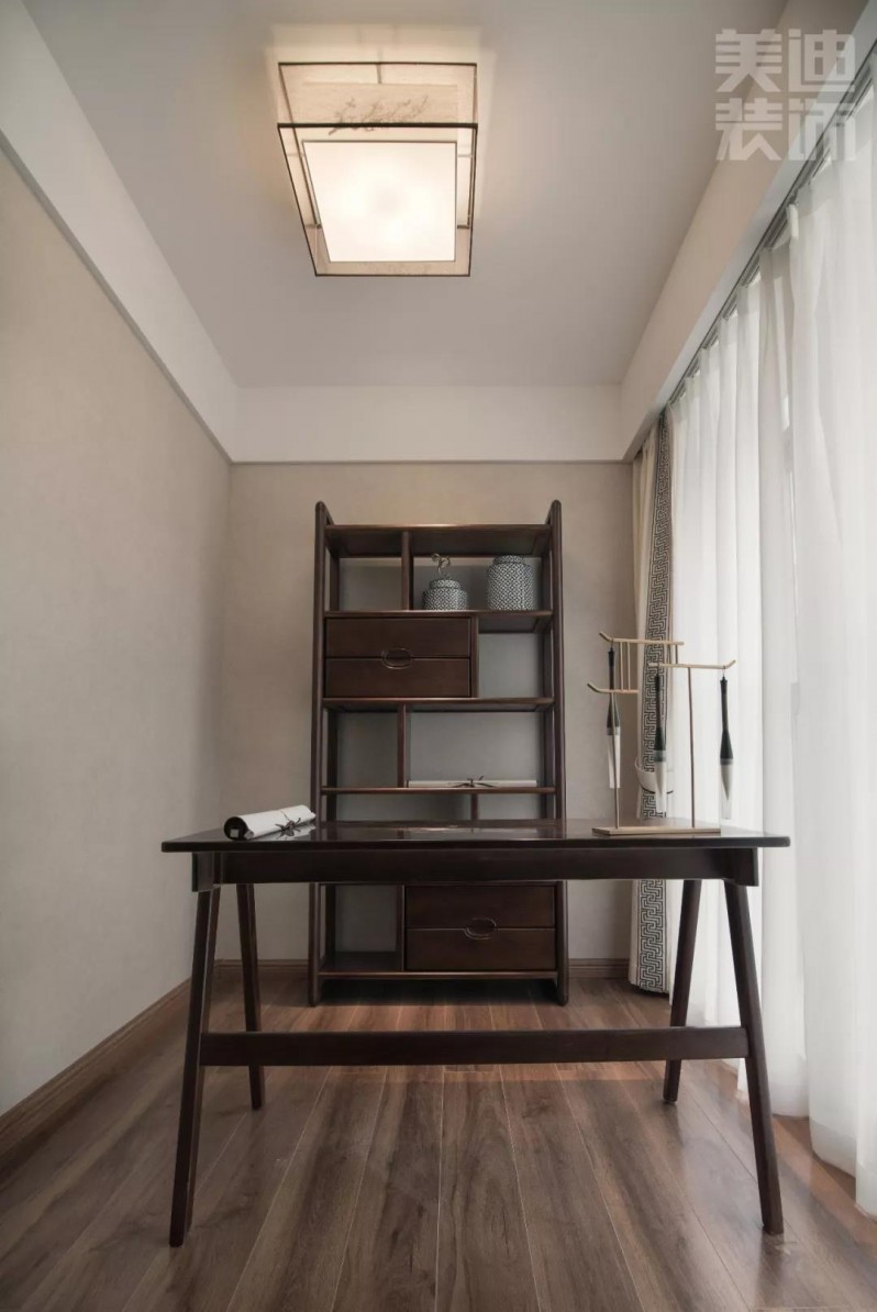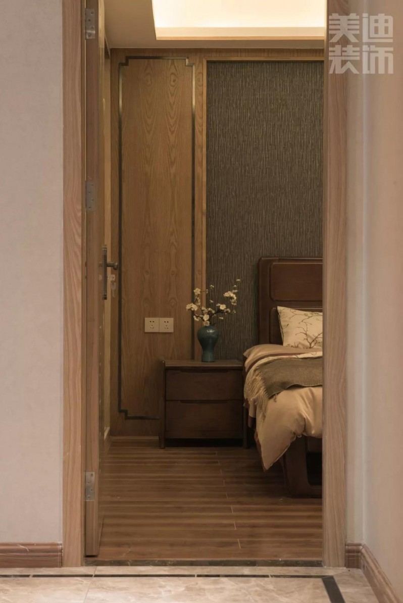卧室整体色调以灰、褐色为主,在淡然中又有了一份成熟的韵味。设计师采用长形木地板铺就,舒缓了空间狭促感,平添一份清雅质感。卧室作为现代人重要的休憩之所,是唯一可以真正放松自己的地方,新中式风给人一种宁静致远的感觉。