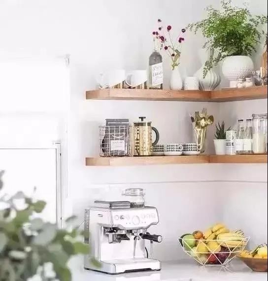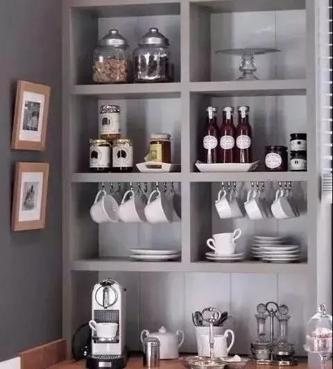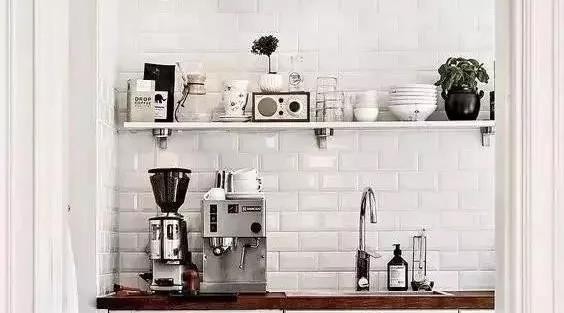 △厨房是咖啡角最常见的地方,在台面上一字型摆开咖啡相关的物件,这是比较常规的做法。充分利用厨房的墙角,用搁架收纳咖啡杯和咖啡豆~