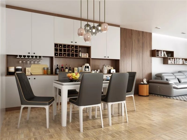 大户型客餐厅当然要设计一个大面积餐边柜,使用方便又能增大储物空间。这款餐边柜上方设置掩门储物柜放置不常拿取物品,中部开辟酒格放置酒水饮品;操作台高度设计合理,符合人体拿取习惯。