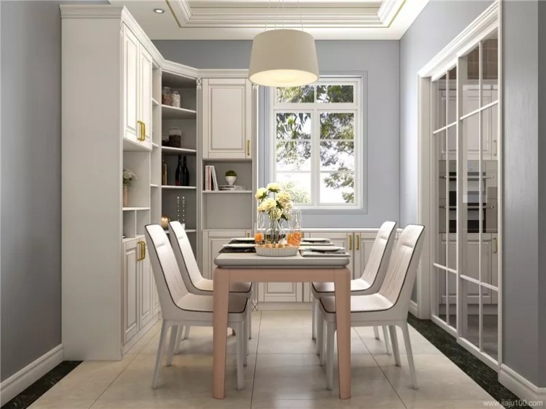 餐厅成长方形,由于一面墙太过狭隘,所以用一个圆弧柜将两面墙的柜体连接了起来,这样能够增大了收纳空间,更能利用弧位的特别造型做装饰柜,不会占用太多的空间,也可以起到更好的装饰效果。