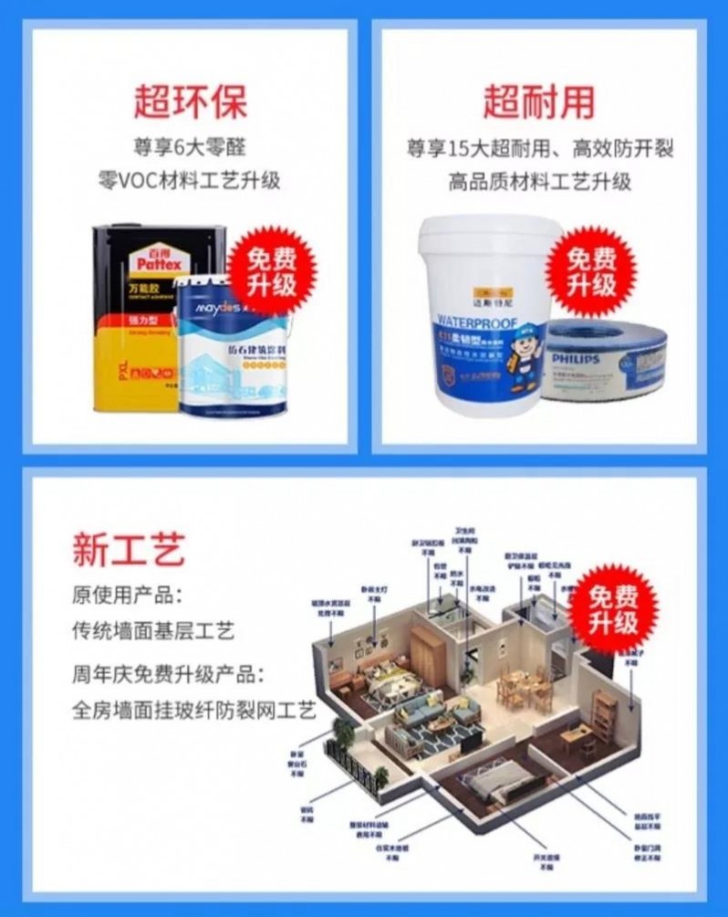 材料工艺升级不加价全房32大项目全包不限量,全场任性不加价