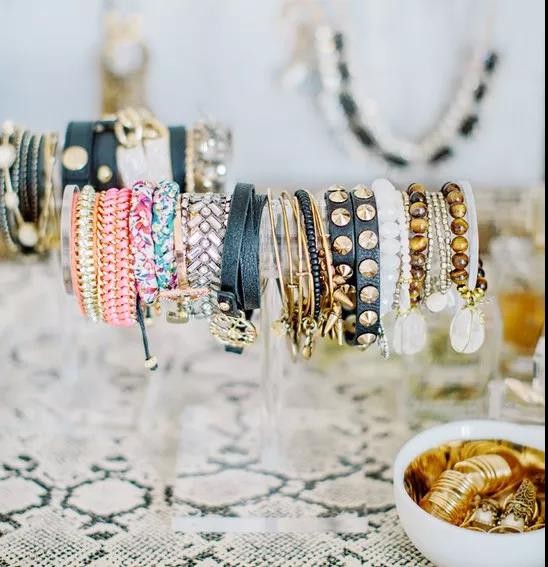 关于手链的收纳有专门用来放置的收纳架,它的迷人之处在于除了收纳,各款手链手镯挂上之后,也能变成一道风景线。