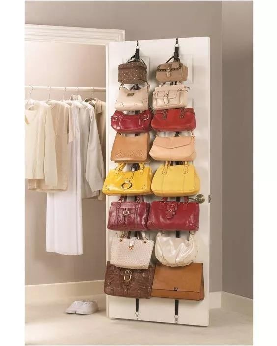 这是针对常用且面料比较硬的包包,你可以选择将它们挂起来,方便选择。不过要注意的是,你一定要将包包里面的东西进行“清空”,以免太重的包包挂久了出现变形或是包带损坏。这只是听上去很麻烦,其实实践起来很简单。你只需在包包收纳位置放置一个盒子,每天一回家,包包里面的东西一倒就行了。
