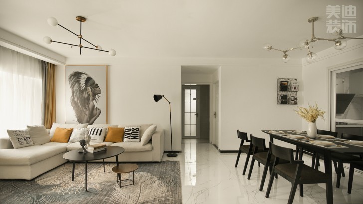 由于现代风格线条简约、装饰元素少,其家具需要完美的软装配合,才能显出美感。比如,沙发上需要有靠垫、餐桌上要有桌布、卧室床需要有窗帘和床单做陪衬,软装到位是现代风格装饰中的关键。一张沙发一个茶几一个电视柜,简单的线条加上简单的组合,在配合几幅超现实主义的无框画、金属的落地灯灯罩、个性的抱枕等简单的元素,就构成了一个舒适简单的现代风格空间。