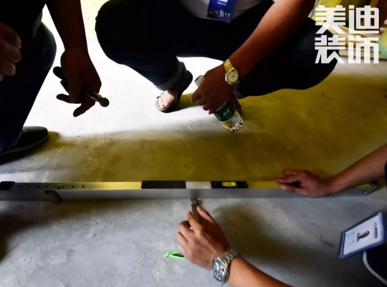 △ 仔细测量地面的水平度,从各个角度对在施工地进行严格检查,力求打造美迪装饰完美工地。