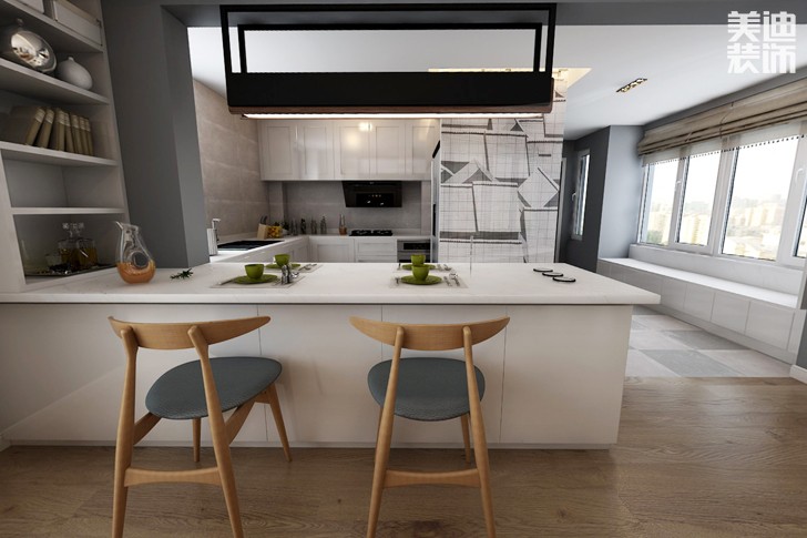 小角落也有大用处厨房中一些小角落通常会摆上一张小桌子,或几把便于就餐时用的椅子。设计师建议选用折叠或长度可调节的连柜餐桌,不用时将其折叠。