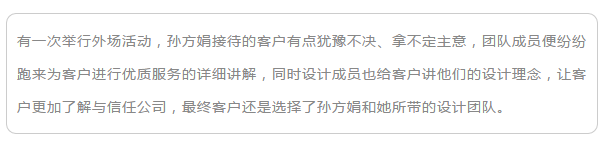 一根筷子容易折,一把筷子难折断,团队亦是如此。不同于一般设计团队的带领者,孙方娟看似温润而泽的性格背后,是在潜移默化之中将团队合作精神“融入”每一位设计成员的灵魂。打造一个有高度竞争力的团队,对外客户至上、对内团队作战,共同成长,共同进步。
