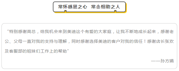 孙方娟说这件事情让她感受到团结的力量,团队的成员都在用实际行动真正践行了那句“以客户为中心”的服务理念,积极维护公司的形象与口碑,让客户满意在美迪。