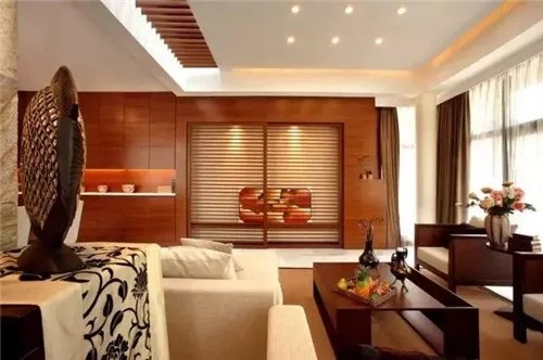 这款现代中式客厅装修中,整体采用了简单线条+棕色实木材质来装饰,没有采用过多的装饰,只以光滑的平面为处理。在昏黄的灯光下,更有着暖意之中的宁静感。