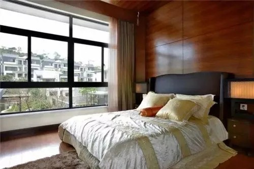卧室墙面以窗而设,达到了很好的视觉效果。墙上以黑白黄+竖条状的壁纸来装饰,带来了简洁硬朗的质感。家居以深棕色的实木材质来装饰,整面墙以橱柜的设计,很好的展现了设计感与实用性并存的局面。床上丝绸质的床品,与整体简洁中又展现了大气。