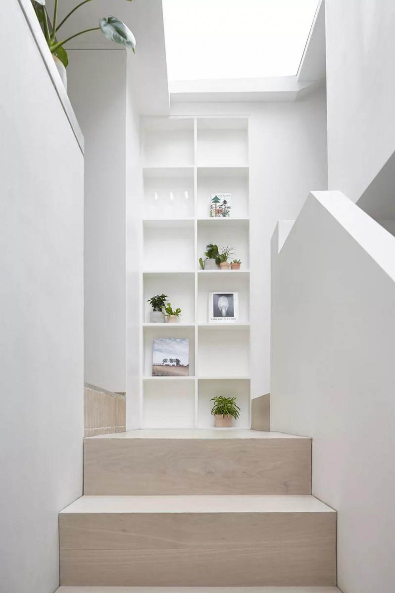 楼梯左侧通往二楼厨房,右侧通往三楼休息区。楼梯分岔口做了壁龛的收纳用以展示小盆栽和书籍,配合自然光的衬托,狭窄的空间也有了更多的活力趣味。