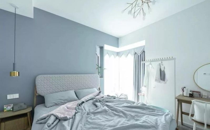 私人空间当然也要使用业主最爱的蓝色,金色的吊灯成灯最亮眼的点缀。带个转角小阳台,使卧室更加温馨惬意了。女主人自称是空巢少女,有时候生活的节制,有时候又生活的随性,精致的梳妆台让她总不会忘记做一个精致的佩奇女孩。