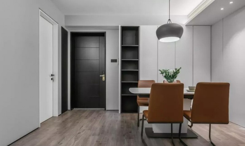 餐厅浅灰色搭配灯带和点光源,室内环境自带柔光效果,让疲惫了一天的眼睛得到放松。而沉静的黑色在哑光的效果下,也添了几分柔和。橘色餐椅,在黑白的空间中有一种跳跃感,为餐厅注入了年轻的活力。