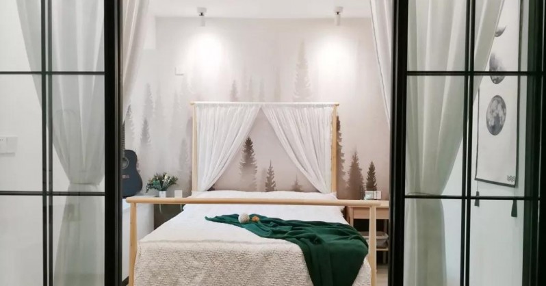 硬朗质感的黑框玻璃移门,清新别致的迷雾森林壁纸,带来硬朗与柔和的碰撞。双人床的自然原木色更增加了房间的森系空气感。