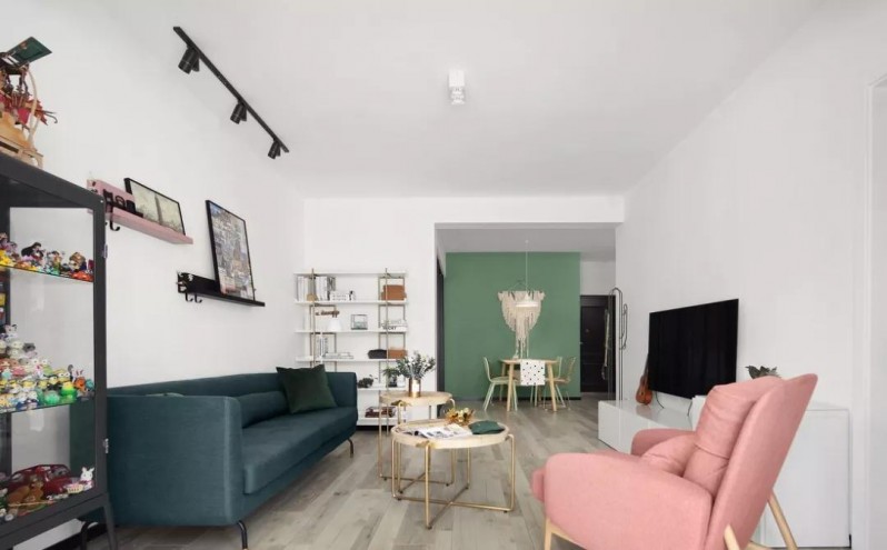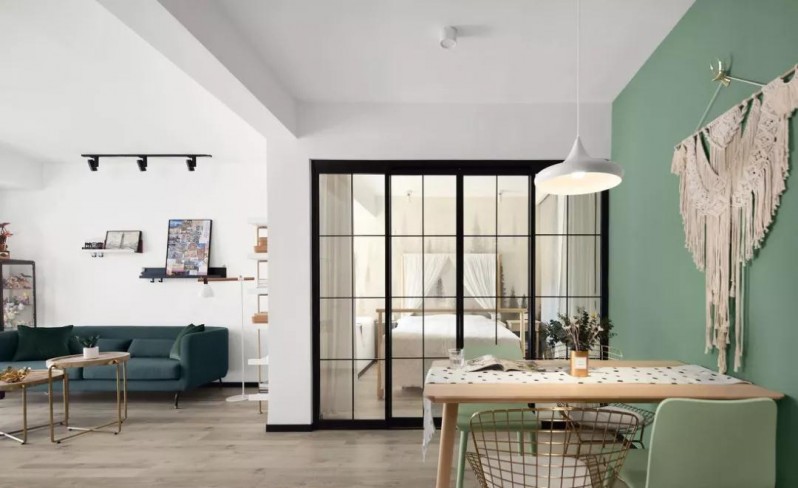 从阳台看向客餐厅,视野开阔明亮,浅绿、茱萸粉、墨绿的清新魅力一览无余。