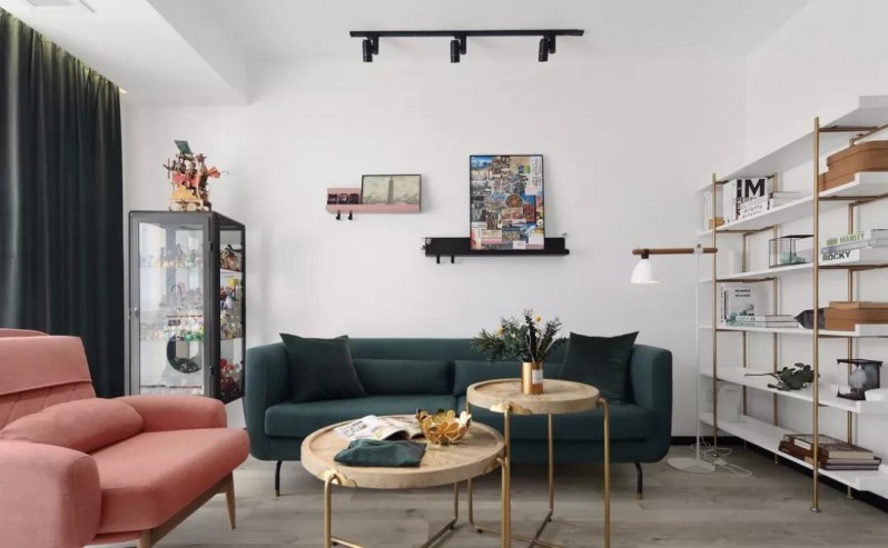 客厅,墨绿色的窗帘着重地勾勒出房间里的自然光源。