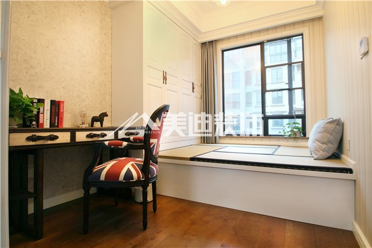 书桌、中式太师椅、美式柳丁皮榻,加上暖黄的阅读灯,在北欧黑色高架床的衬托下,是不是有种老上海的错觉?完全满足了腔调书房的需求。