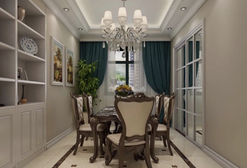 餐厅与客厅是相连接的,用波打线划分出餐厅部分,拼花为点缀,色调与客厅相符合,整个色系统一,又易区分。