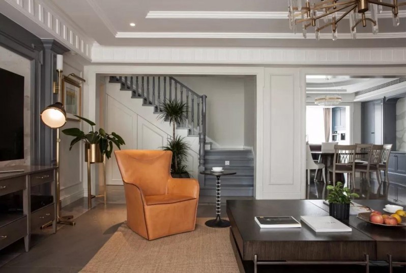 为了避免空间氛围走向高冷,以栗色的木质家具,绿植和橙色沙发椅让空间更加温暖、平和。黄铜元素、皮质沙发,以此提升空间的轻奢质感。