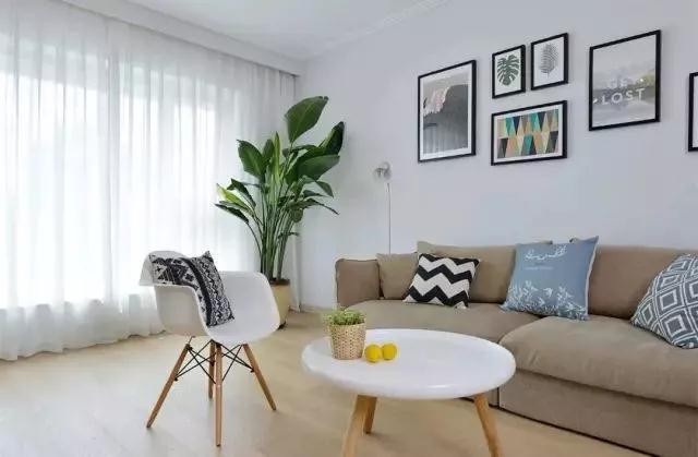 极简的圆形小茶几,在不需要的时候可以挪到电视柜或沙发旁,让整个客厅更加宽敞通透,现代舒适的布艺沙发,搭配上一组简约美观的照片墙,结合两侧清新的绿植,点亮了空间的文艺与清新!