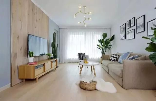 自然的原木与绿植点缀,更是让空间充满了清新舒适的氛围气息;电视墙以原木质感的木饰板打造,搭配上原木地板与电视柜,整个简洁的北欧空间,显得年轻又舒适。