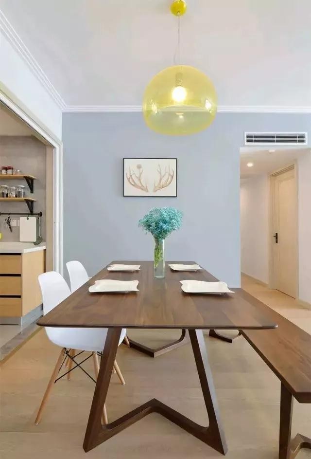 餐厅摆上一套极简的北欧原木餐桌椅,搭配上天花板那盏黄色灯罩的独特吊灯,显得年轻大胆又有艺术感!