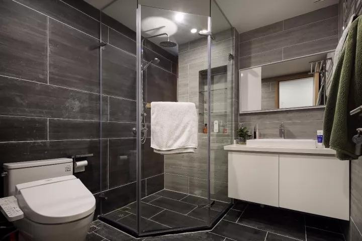第一,做个大型的浴室柜子,把脸盆放柜子里面,浴室的东西都有地方放不说,小物件都能"藏"起来,就显得干净清爽多了~