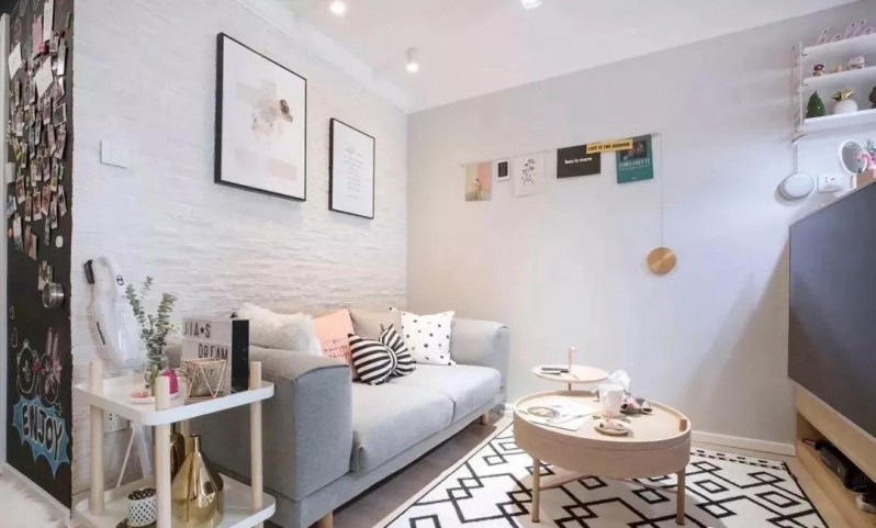 沙发背景墙用白色文化砖做点缀,虽然同是白色,却比只刷白漆的墙面多了几分线条感。灰色沙发搭配原木色家具,穿插一抹粉色调,俏皮清新。