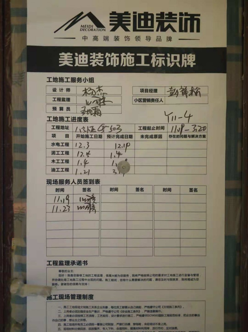 一进门我们可以看到《美迪装饰施工标识牌》,上面记录了各项施工阶段的起始时间和验收时间等。业主只需要通过这张表,就可以得知自己家的装修已经进行到哪一步。