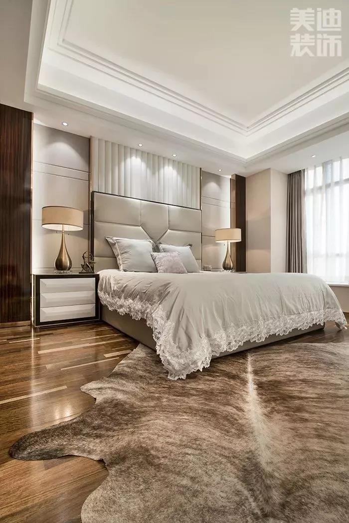 大面积的白与浅色色调赋予了卧室充满静谧舒适的生活氛围, 天然的虎纹牛皮地毯与温润的木质地板让卧室洋溢着自然气息,迷人魅力,直撩心底。