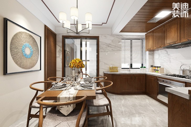 不要只在厨房中央单独安装一个照明光源,在洗涤、准备、操作各区也应分别安装照明光源。如果厨房空间够高2.7米以上还可以选择在天花上安装透明或半透明的吊灯作为光源,这时灯不仅可以提供最佳的照明,还是很好的装饰品。