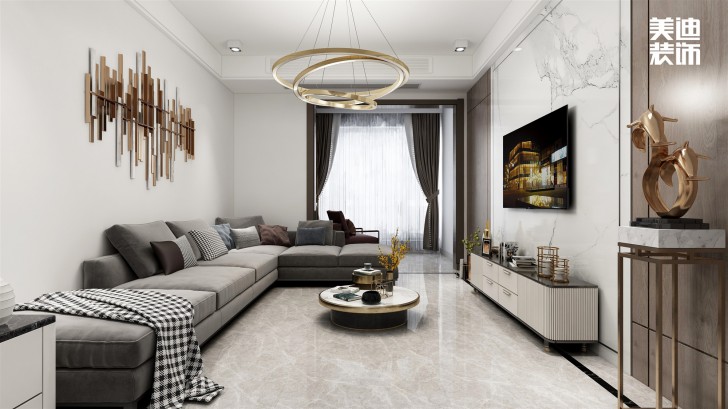 五矿万境水岸95㎡北欧轻奢风格案例效果图—客厅